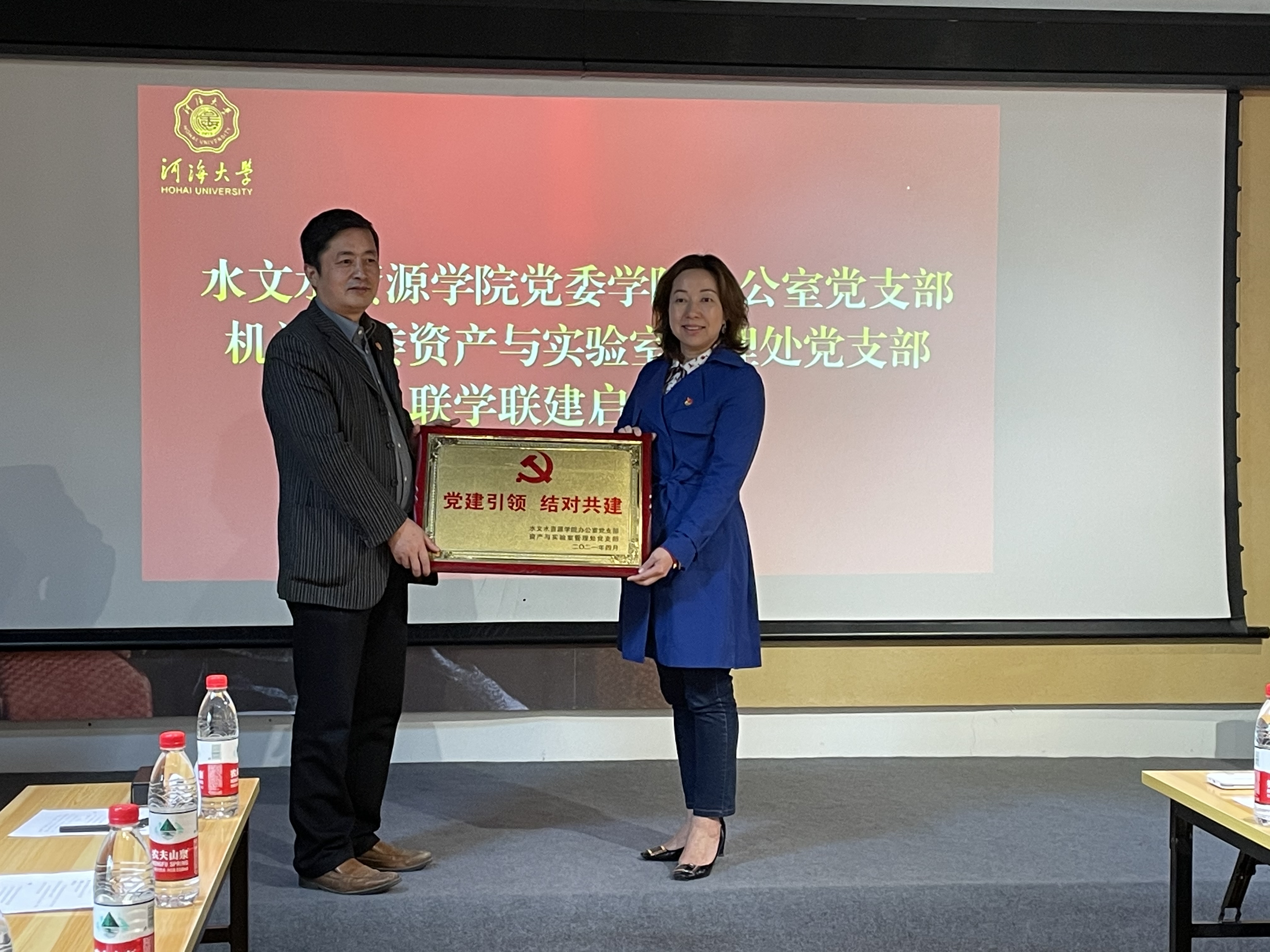 资产与实验室管理处党支部向学院办公室党支部授牌、赠书。