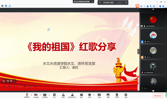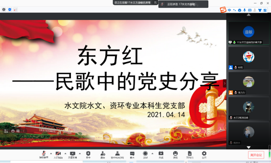 2021年4月14日晚七点半,成人抖音 水文、资环专业本科生党支部“民歌中的党史” 音诗画分享会主题党日活动如期开展,支部书记张力力同志主持了本次分享会,支部全体党员同志参与本次主题党日活动。
