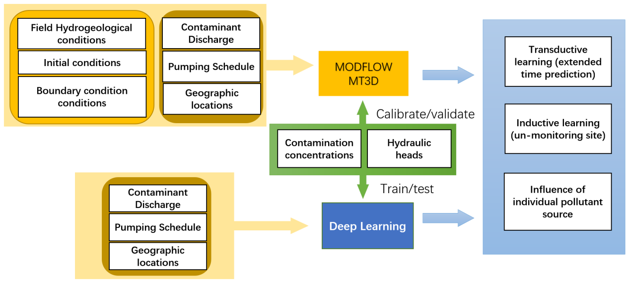 图1. 污染物迁移建模工作流程和数据的概览,使用两种方法:深度学习和基于物理的模型(MODFLOW 和 MT3DMS)。这些模型在三个任务中进行评估:直推学习、归纳学习和模型解释。