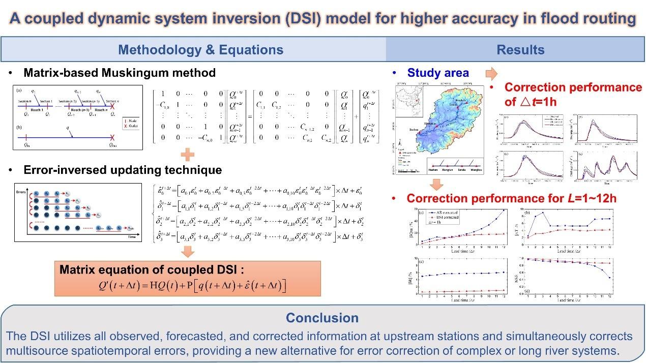对复杂或较长的河流水系,洪水预报误差将随着洪水演进计算不断地被传播、累积和放大。为此,研究团队提出了一种具有自适应特征的动力系统反演模型(DSI model),可对复杂河流系统的长河段洪水演进过程中的误差进行实时校正,通过降低上游各站点/断面的预报误差,从而提高下游站点的洪水预报精度。DSI模型的核心是耦合了马斯京根法矩阵方程与动力系统反演方程。应用结果表明,DSI模型的校正能力强,校正效果随预见期增长衰减缓慢,鲁棒性优于传统校正模型。