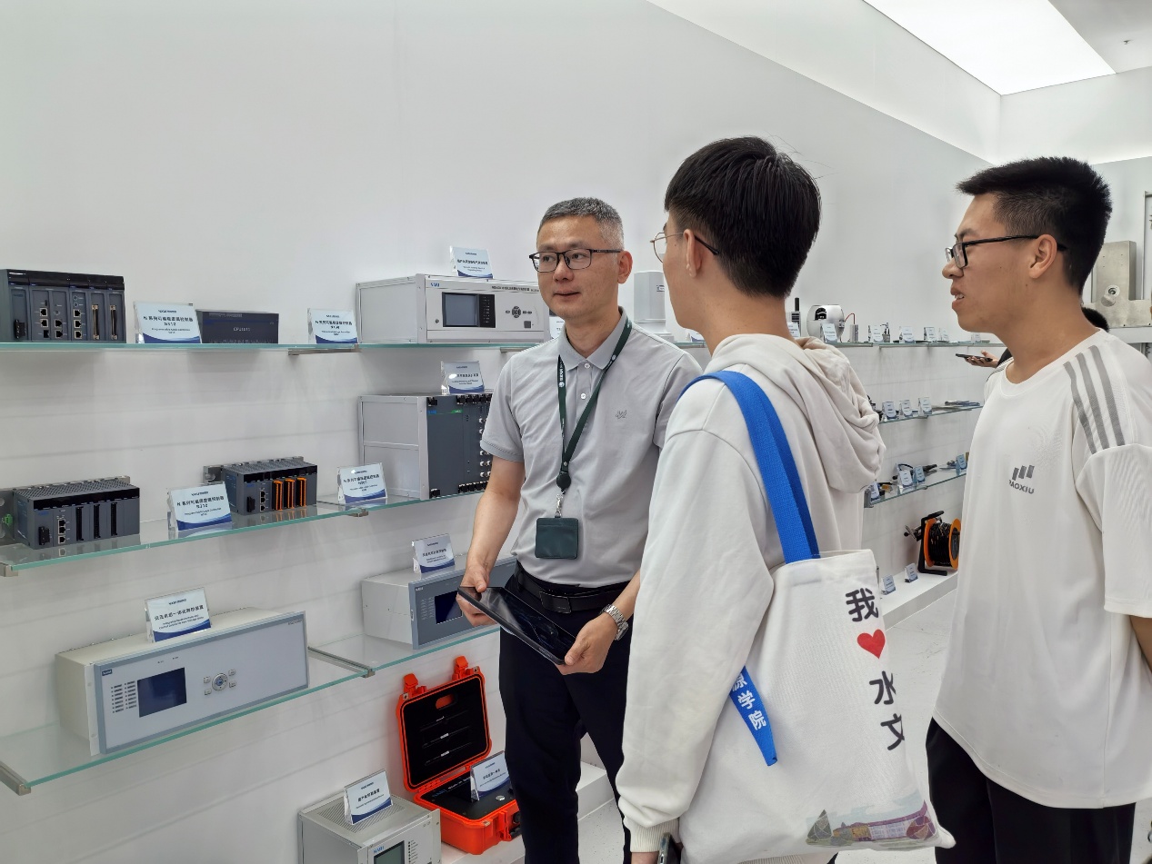 在南瑞集团,同学们走进企业展厅和核心实验室,“沉浸式”体验了企业精神文化,参观学习了企业在水电自动化与智能化、继电保护、能源互联网等领域的创新成果和技术优势。交流环节中,南瑞集团技术专家围绕智慧水利、智慧气象、数字孪生流域等领域的国家战略需求,为同学们深入浅出地讲解了信息技术与水文学及水资源、城市水务等学科的交叉融合现状与应用前景。在自由提问环节,同学们积极互动,就专业选择、形势政策、面试细节等问题展开深入交流。