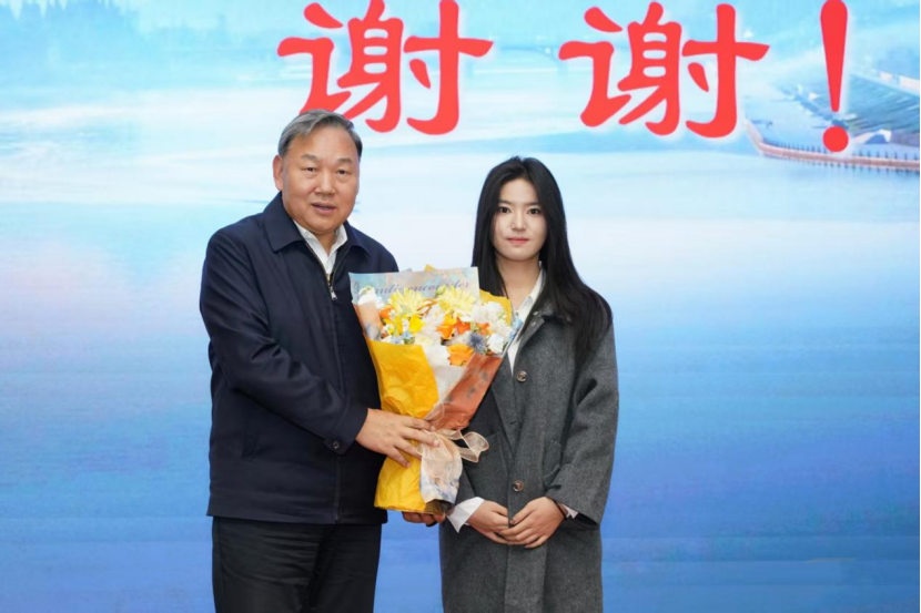 讲座结束后,由新生代表上台,向陆桂华教授献上鲜花,以朴素而真挚的方式传递全体师生对他的敬佩之情。