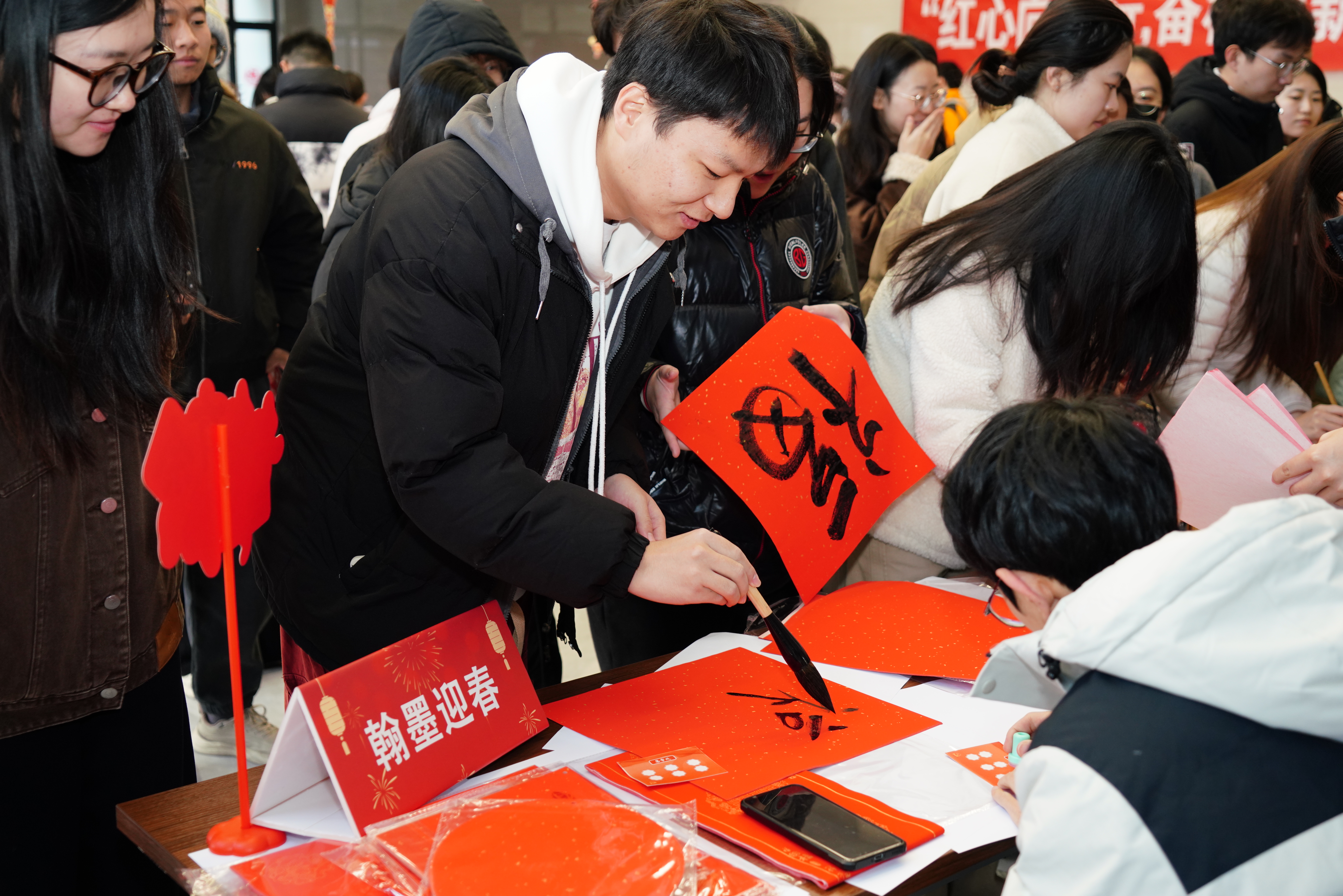 现场还设置党员先锋岗,由党员同学们为学院师生撰写“福”字、拍摄打卡照片,以实际行动展现新时代党员的担当与服务精神。此外,本次活动依托线上平台开展跨校区知识竞赛,增强了三校区联动与学习交流。